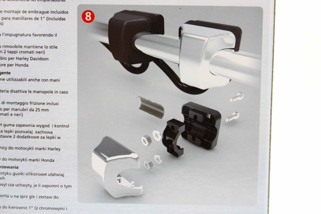 im Lieferumfang eine Bedienungsanleitung und zwei Sätze von Lenkerblenden: Chrome und dunkel,