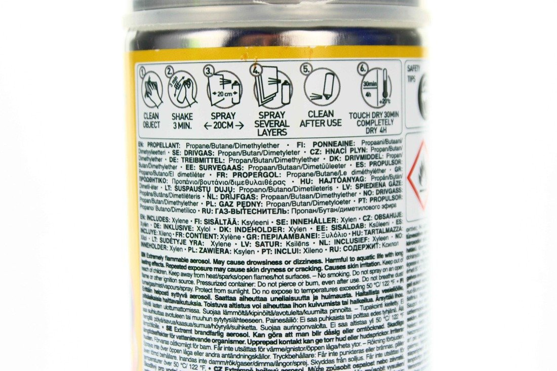 Nach dem Auftragen reinigen Sie jeder Schicht die Aerosoldüse, indem Sie die Dose „auf den Kopf“ stellen und die Düse so lange drücken, bis nur Gas aus ihr austritt.