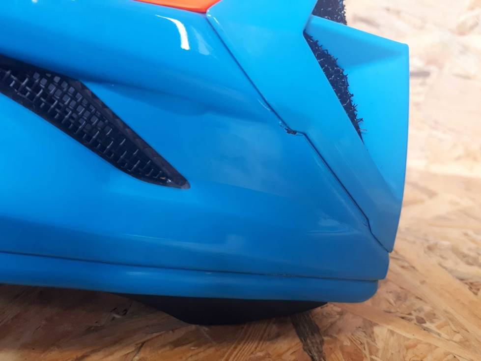 Helm mit ästhetischem /Lackdefekt, der Defekt wurde durch das Trocknen des Helms in der Fabrik verursacht (B -WARE). Die größten Mängel sind mit einem Kugelschreiber gekennzeichnet, es können auch andere kleinere Lackmängel vorhanden sein. Die Fotos zeigen genau dieses Exemplar. Der Helm ist technisch 100% funktionstüchtig, mit 2 Jahren Herstellergarantie, ausgenommen Lackmängel.